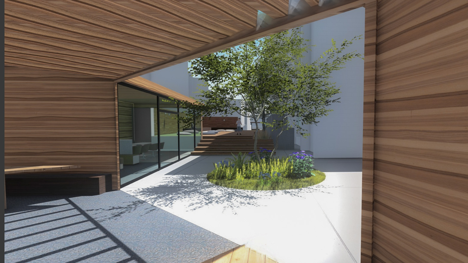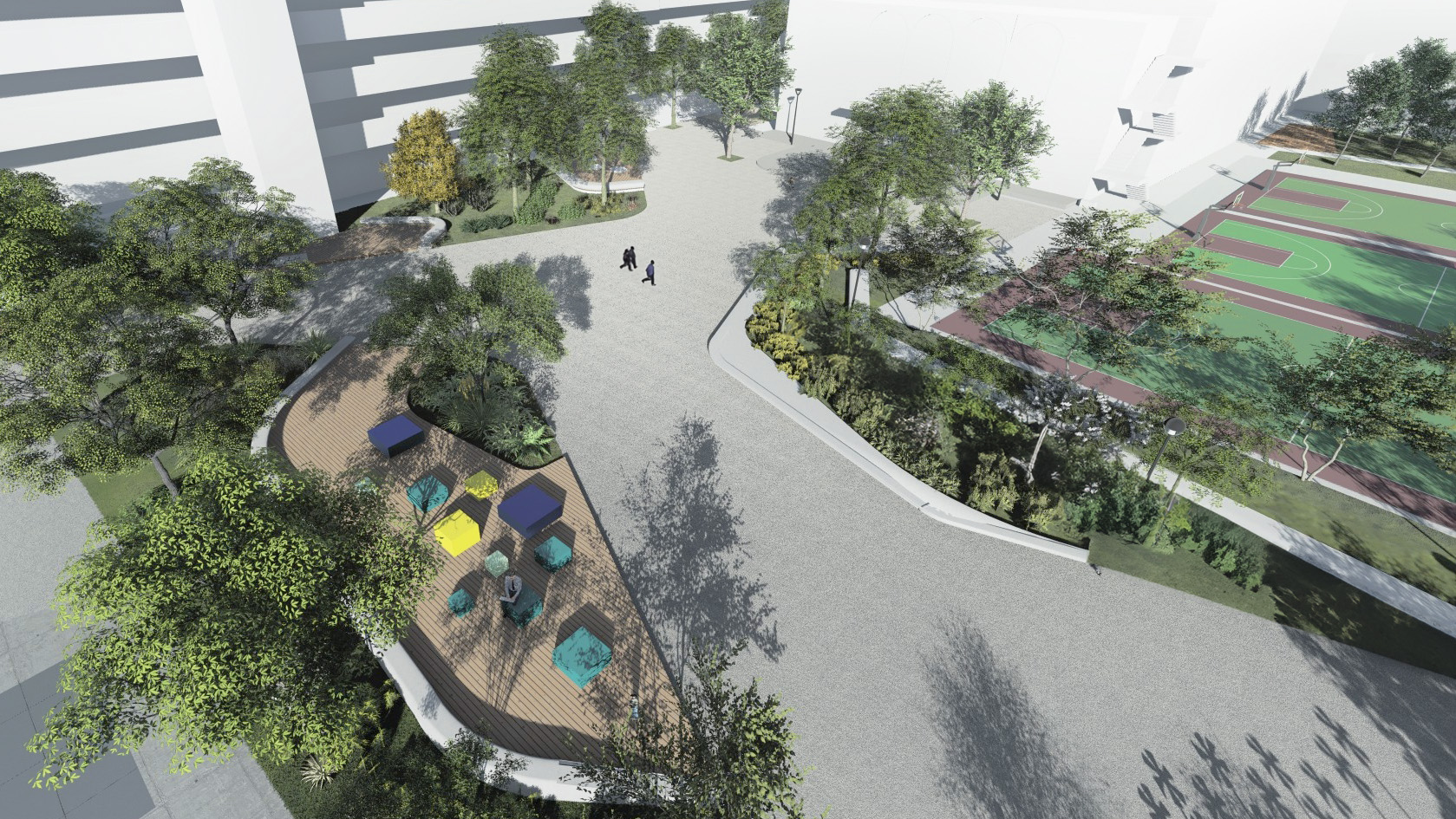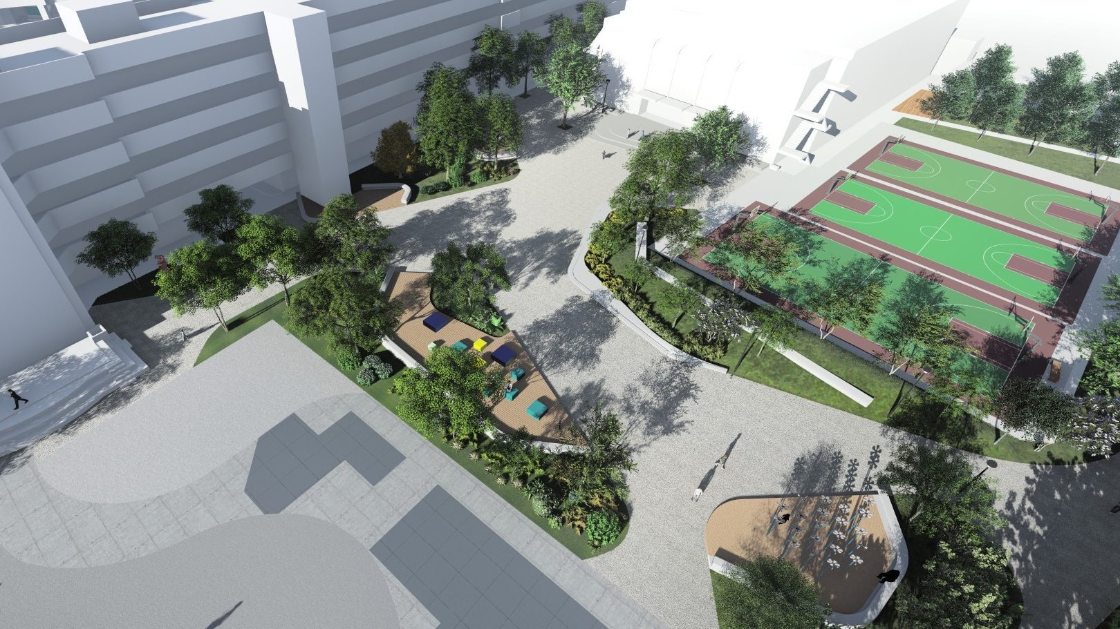 原校園空間架構受建築物與花台組隔,缺少中軸感與校園焦點意象場景感。我們以"一核心兩分區"的概念整合零碎的空間分區,透過教育核心多功能廣場與活動大操場的概念,建構新明道學軸帶串聯校園主體景觀。